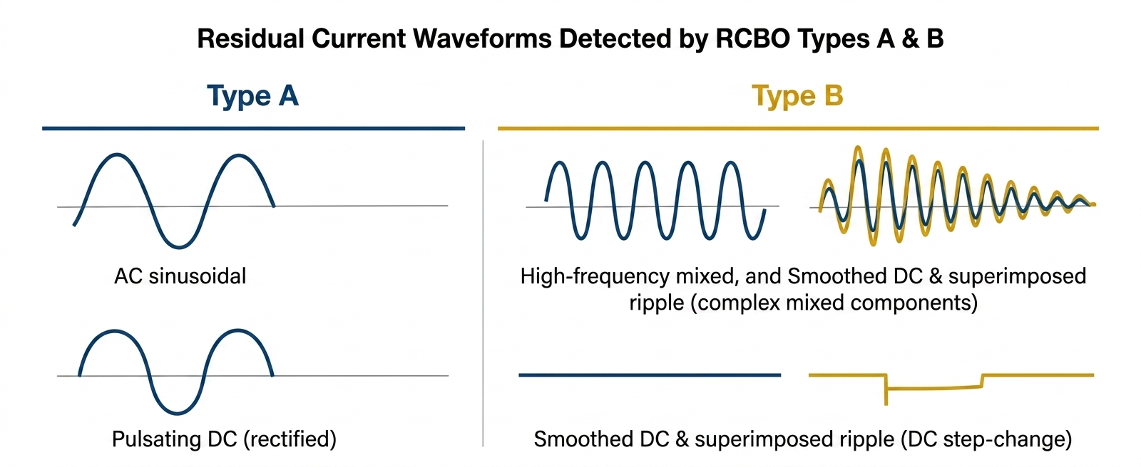 Type AC detects only sinusoidal AC residual current. Type A adds detection of pulsating DC residual current from single-phase rectifiers, SMPS power supplies, and class 2 appliances. Type B extends that to smooth DC residual current from three-phase rectifiers, PV inverters, VFDs, and EV chargers. Specifying Type AC on a circuit feeding a VFD is not conservative -- it's a protection gap that won't trip when it should.